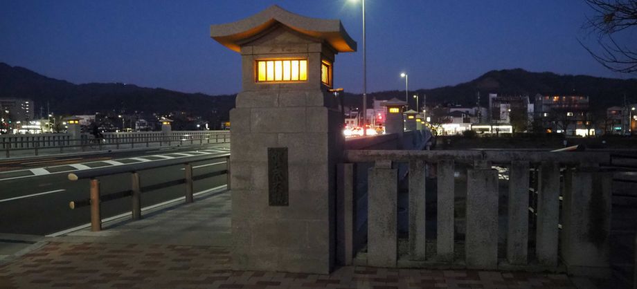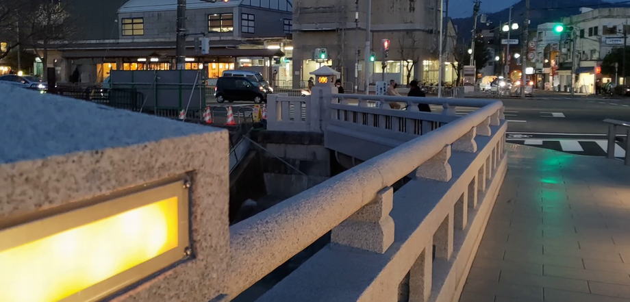京阪出町柳駅前の河合橋です。2022年に補修完了しました。弊社のろうそく色ゆらぎ点灯LEDが灯籠照明に採用されました。
